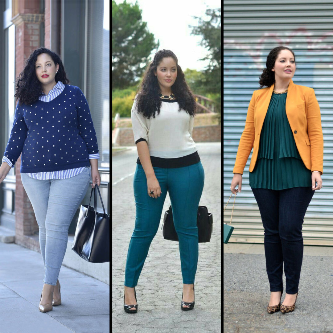 Foto midden: doordat de top die ze draagt korter eindigt dan op haar brede heupen, oogt ze optisch slanker. De horizontale lijn van het witte deel van de top valt het eerste op en die zit nog meer naar boven dan de zwarte lijn, die al wat meer ‘samenvloeit’ met de kleur van de broek. Je ziet duidelijk dat het contrast minder hard is dan de overgang van trui naar spijkerbroek op de linker foto.